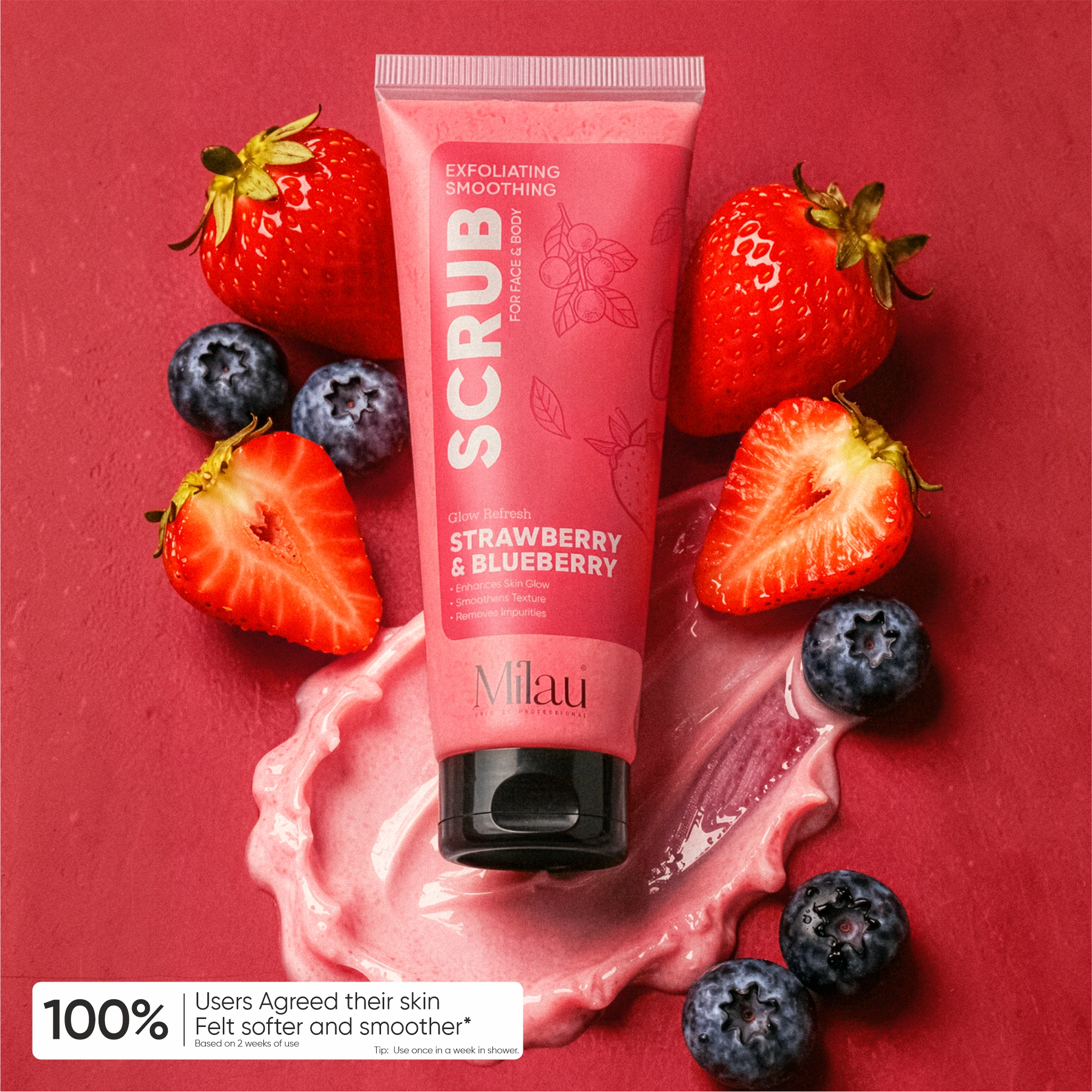 With regular use, this strawberry and blueberry exfoliating scrub helps smooth rough areas, improve skin clarity, and enhance skin radiance. The gentle exfoliating formula makes it suitable for both face and body, making it a convenient addition to your weekly skincare routine.
